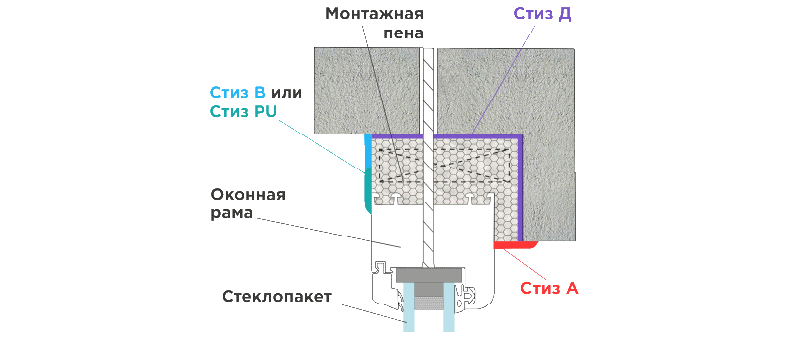 Атмосферостойкие герметики должны выпускать влагу из монтажного шва, но не пропускать воду внутрь. Например, таким герметиком является Стиз А (рис.5). Он устойчив к ультрафиолету и осадкам, поэтому надёжно защищает шов с уличной стороны. Материал сохраняет эластичность при отрицательных температурах, не растрескивается и не отслаивается со временем.