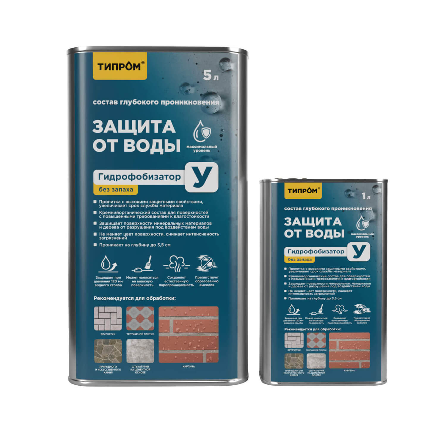 Среди продуктов серии Типром гидрофобизаторами для тротуарной плитки и брусчатки являются составы Типром У и Типром У1, а также Типром М (пропитка с «мокрым эффектом и гидрофобизирующими свойствами»).
